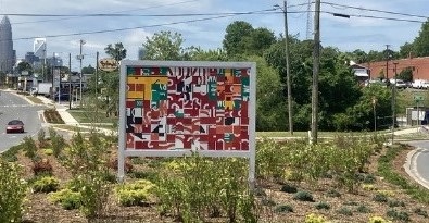 The city partnered with the Arts & Science Council to commission artists Ene Osteraas-Constable and Scott Constable of Wowhaus Art and Design on “A Good Sign,” a unique placemaking initiative that integrates artwork and beneficial plantings to help transform the corridor. According to the artists’ statement, “a series of ‘Good Signs of Nature’ highlight native flora and fauna, while two landmark sculptures feature ‘quilts’ made with reclaimed street signs.” Crosswalks along the corridor feature the cardinal, the state bird of North Carolina.